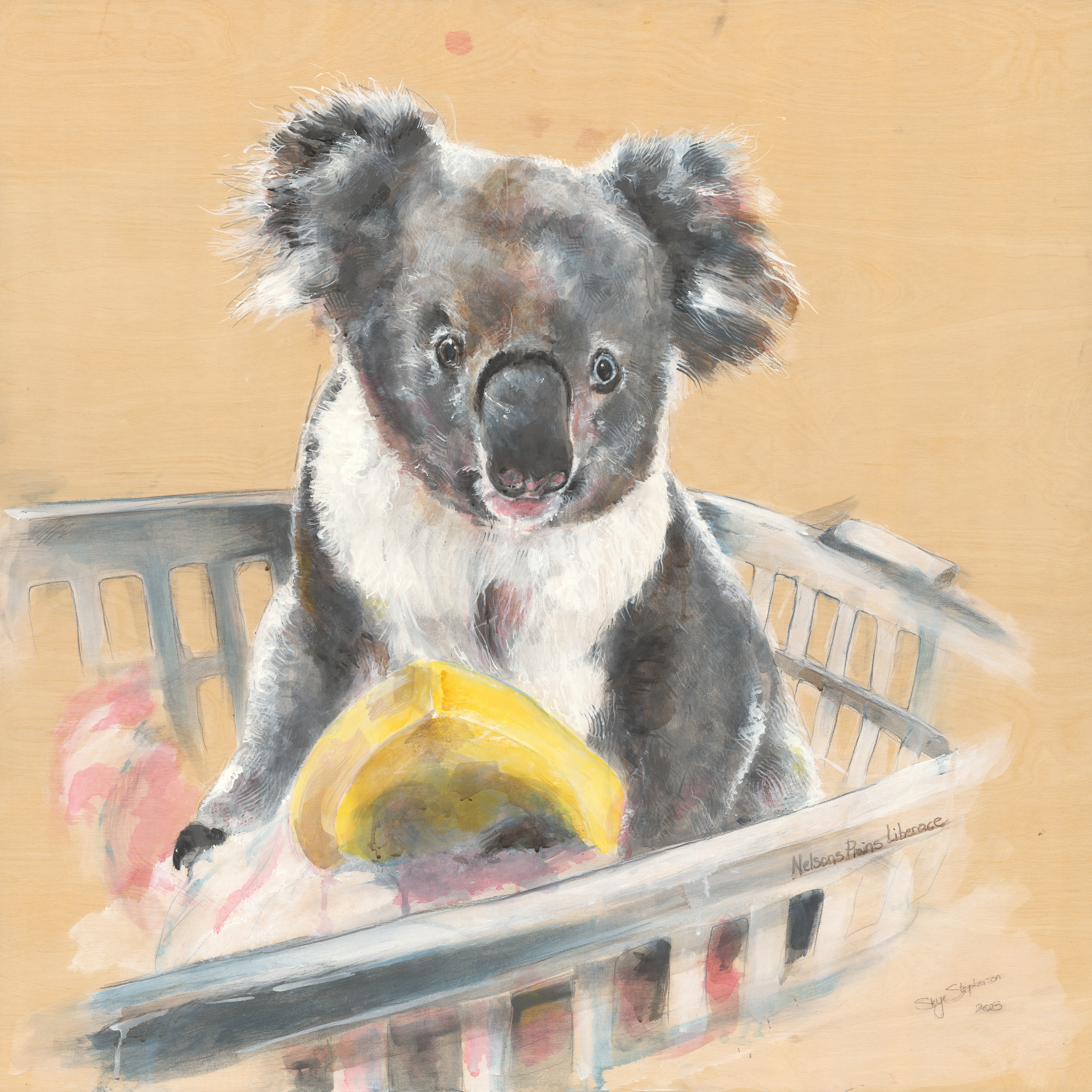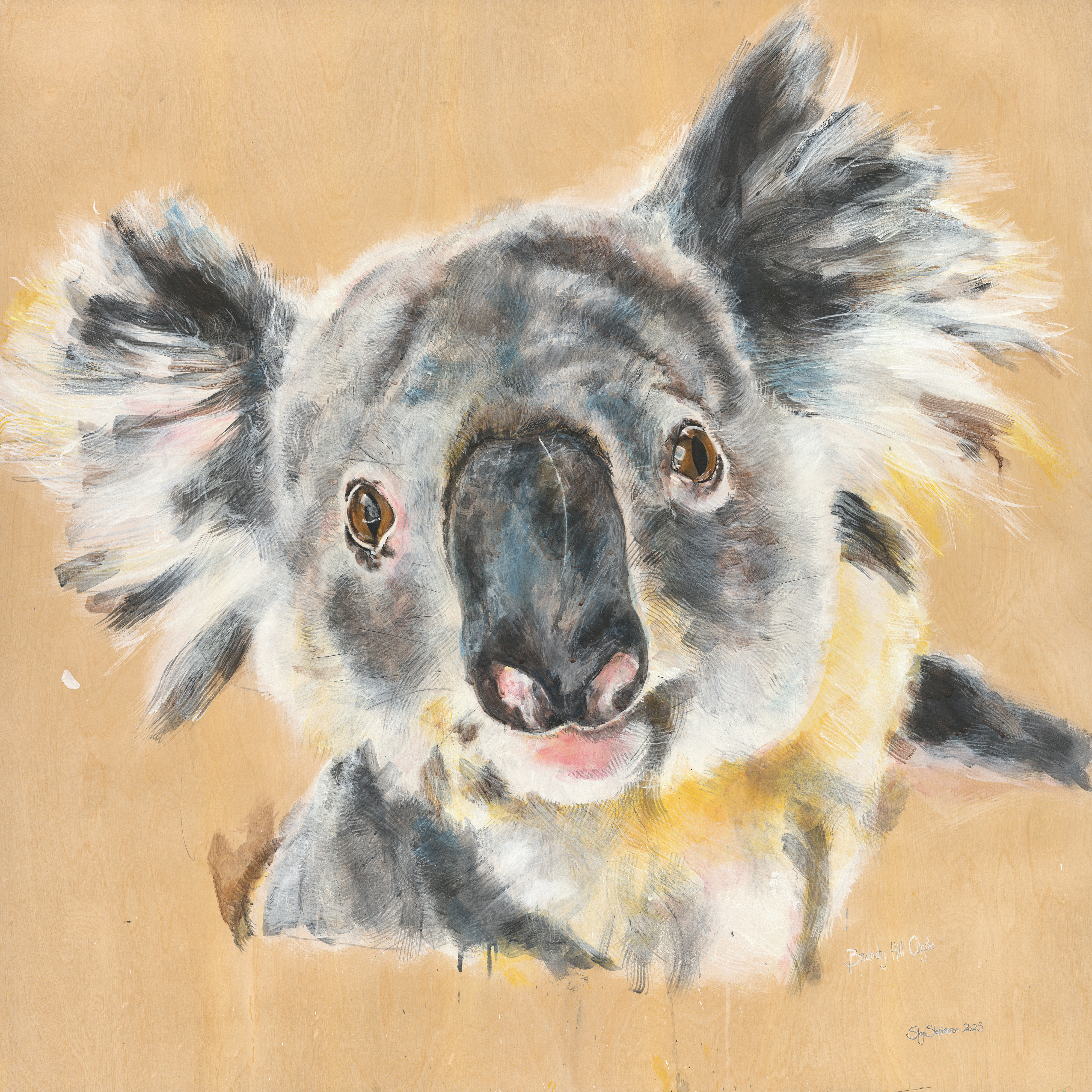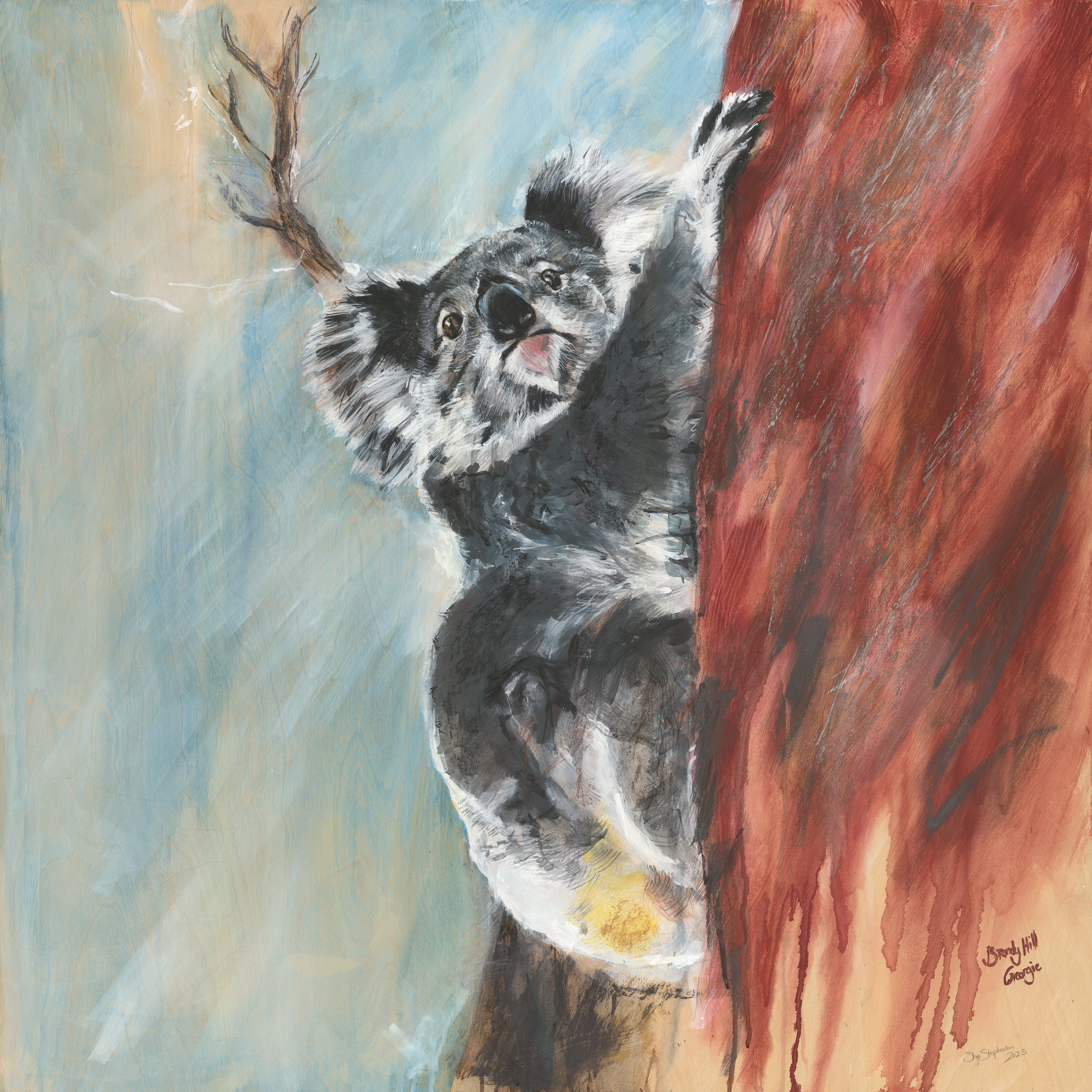 This series of seven koala portraits—Clyde, Gill, Georgie, Gorry, Rellie, Liberace, and Gorry—honours the survival stories of individual koalas returned to the wild by the dedicated team at the Port Stephens Koala Hospital. Rescued from across the West Ward region and released back into their home habitat in Brandy Hill, Hinton, Williamtown, Seaham, and Nelson Plains, these works raise community awareness of the koala populations in our region, encourage preservation of their local environment, and highlight the care and commitment of local wildlife groups working to safeguard their health and habitat.